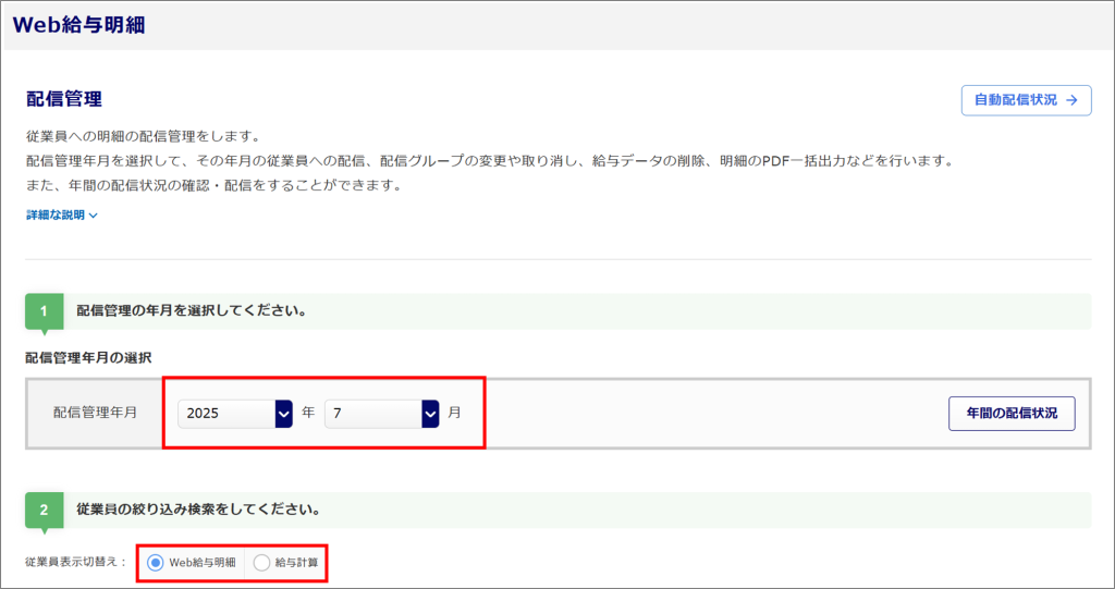 [Web給与明細]>[毎月処理]>[自動配信状況]をクリックします。