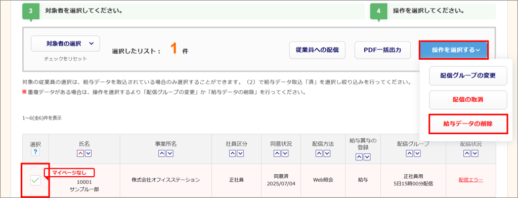 対象の従業員の「選択」列にチェックし、[操作を選択する]>[給与データの削除]>[削除]をクリックします。