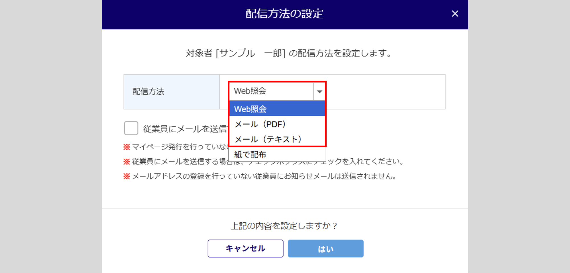 従業員への設定の「②配信方法の設定」画面で、配信方法の変更してください。