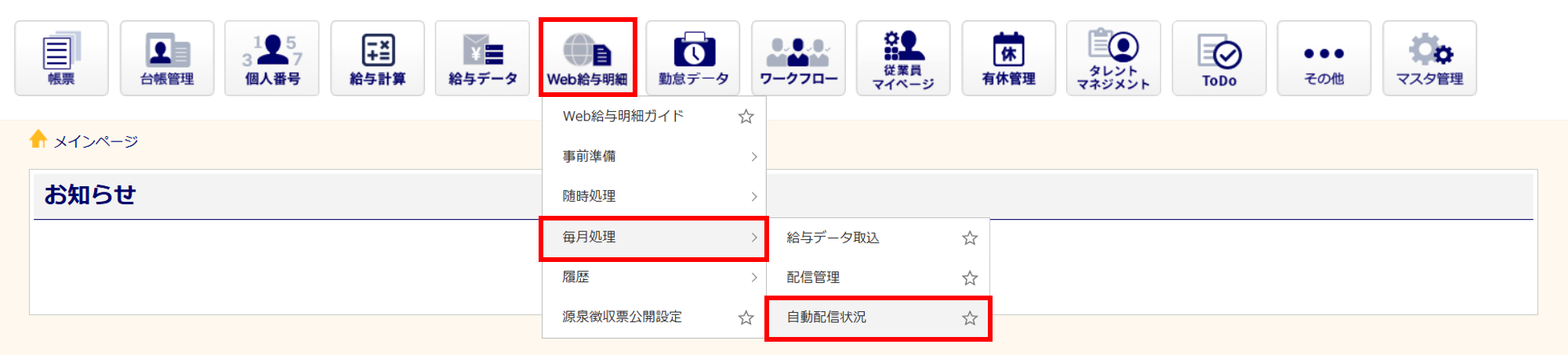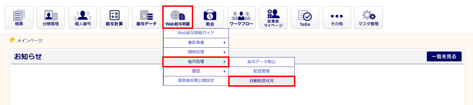 [Web給与明細]>[毎月処理]>[自動配信状況]をクリックします。