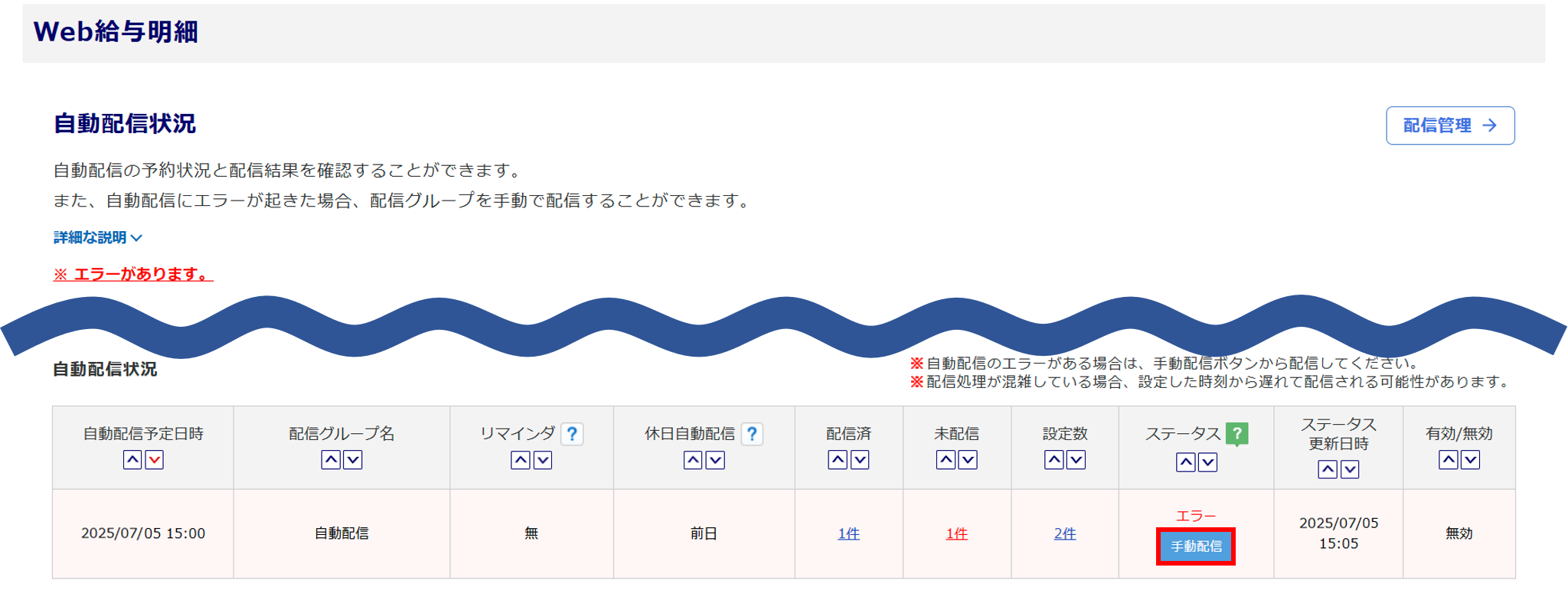 ※「自動配信状況」画面で手動配信をおこなわずにいると、「配信エラー」が表示されたままとなり