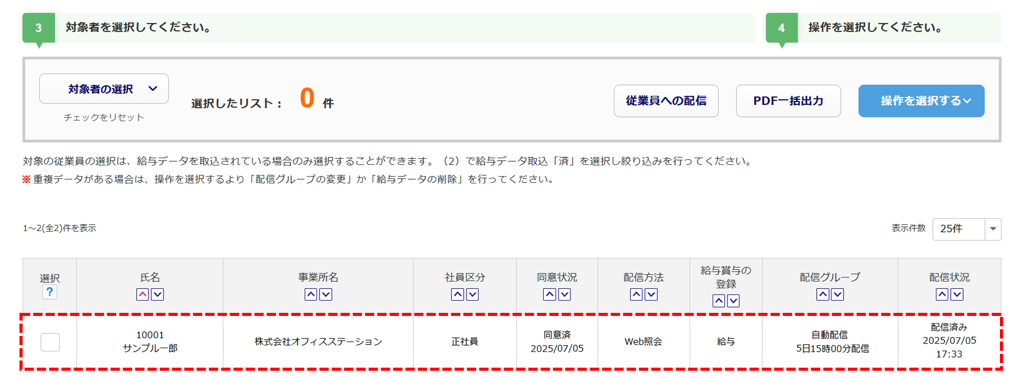 「給与データ取込」等の操作をおこなってから配信する必要があります。 - Web給与明細用台帳を外した場合