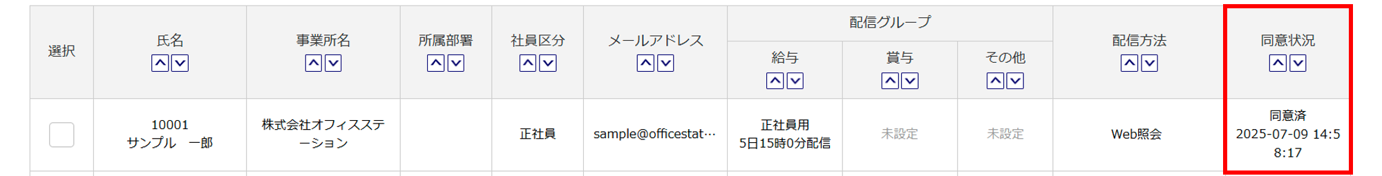 従業員への設定の「③同意状況の設定」画面で、同意状況を「同意済」にしてください。