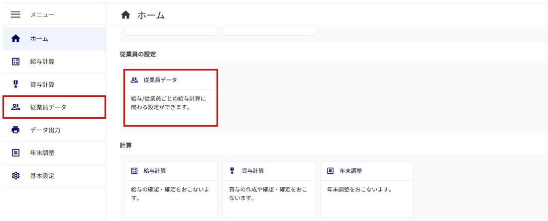 メニューもしくは、ホームの[従業員データ]をクリックします。
