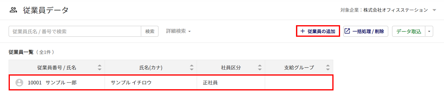 未登録の従業員情報を新たに登録する場合は、[従業員の追加]をクリックします。