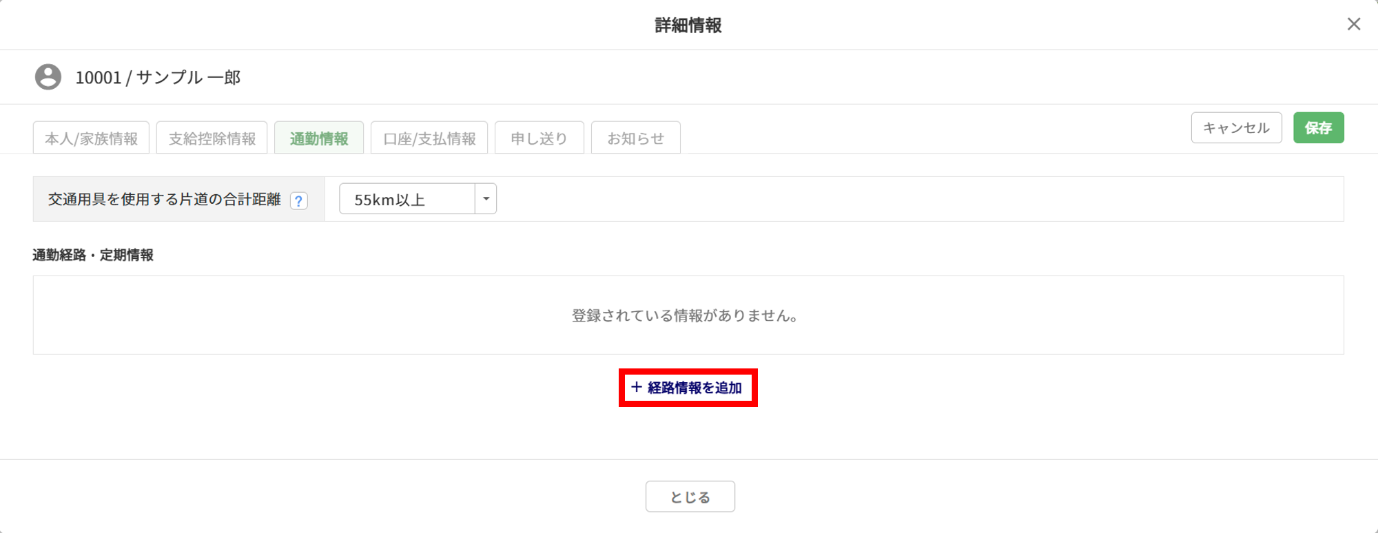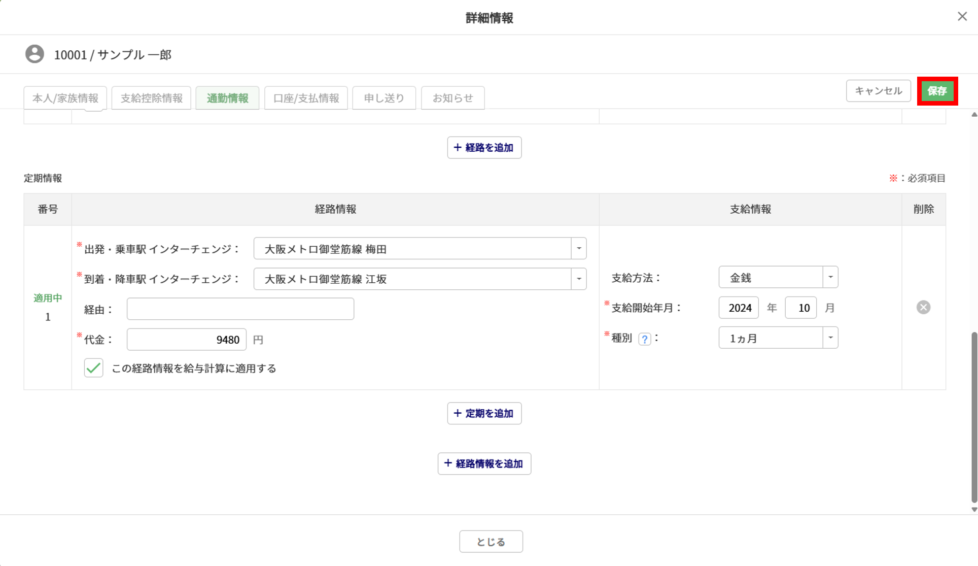 従業員台帳に通勤経路を登録している場合は情報が反映されますので、必要に応じて編集します。
