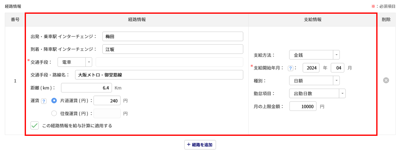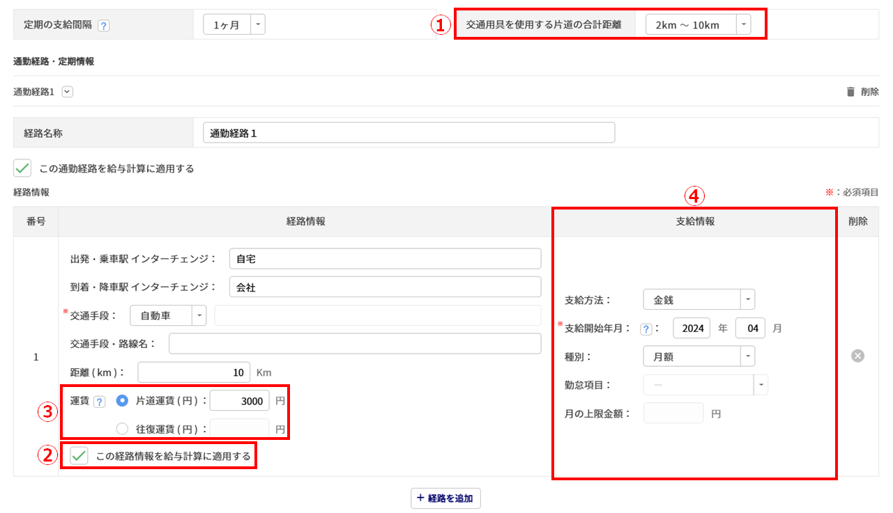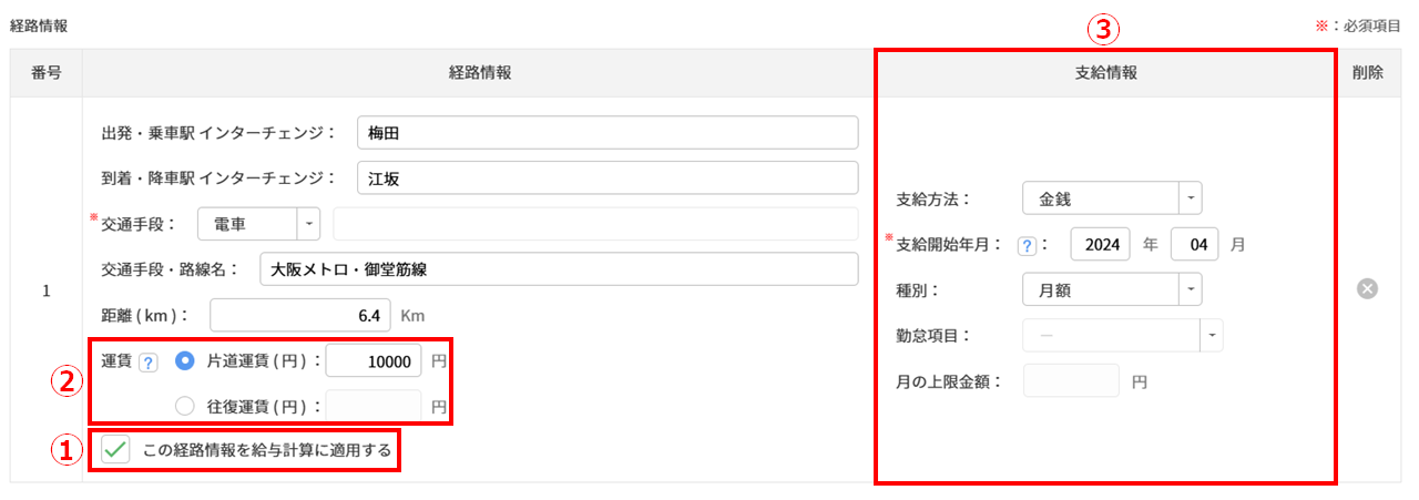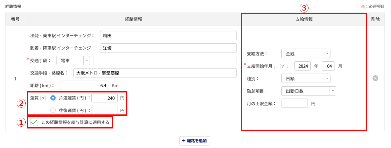 「この経路情報を給与計算に適用する」()をチェックし、「支給情報」()を設定します。