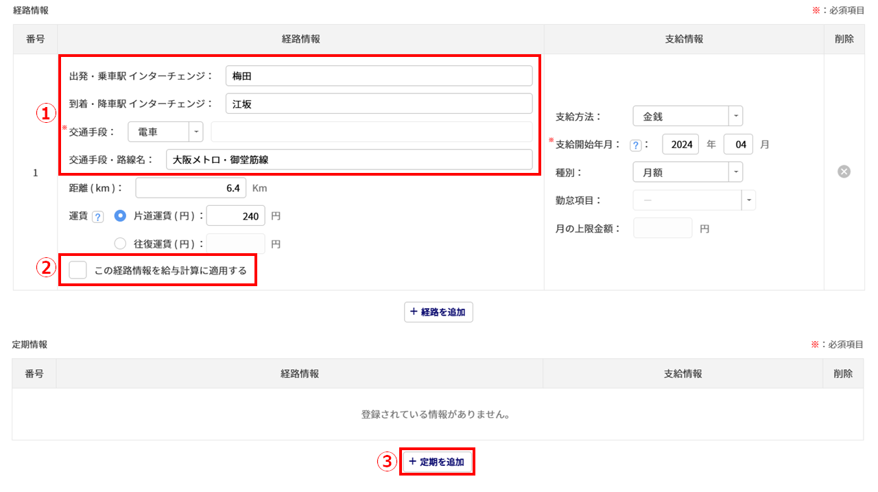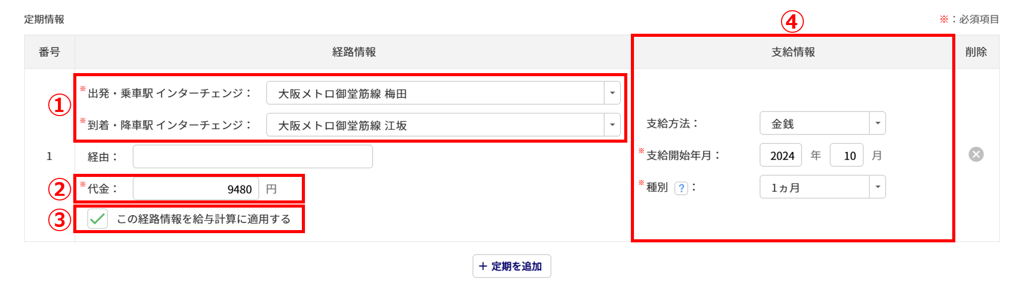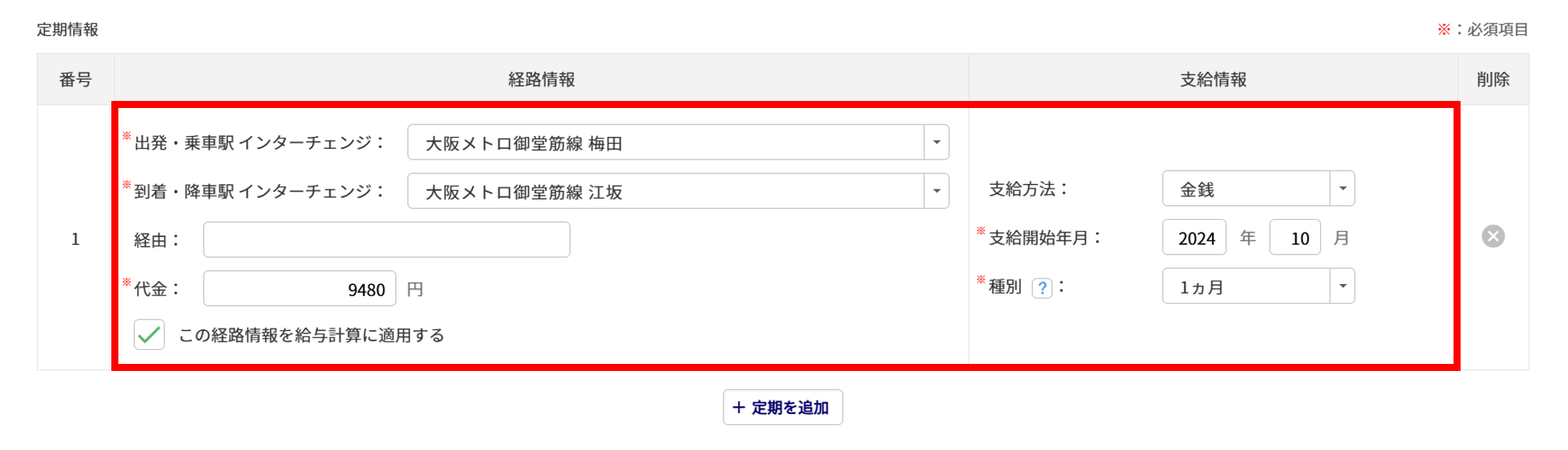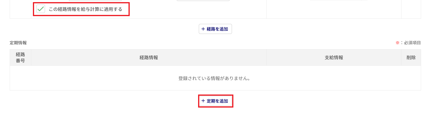「この経路情報を給与計算に適用する」()のチェックを外し、[定期を追加]()をクリックします。