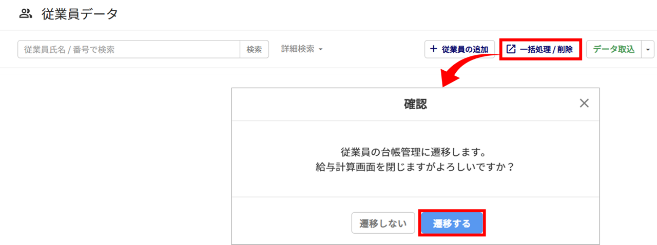 [一括処理/削除]>[遷移する]をクリックすると、給与計算画面を閉じ、オフィスステーション本体の「台帳管理(従業員)」画面が開きます。