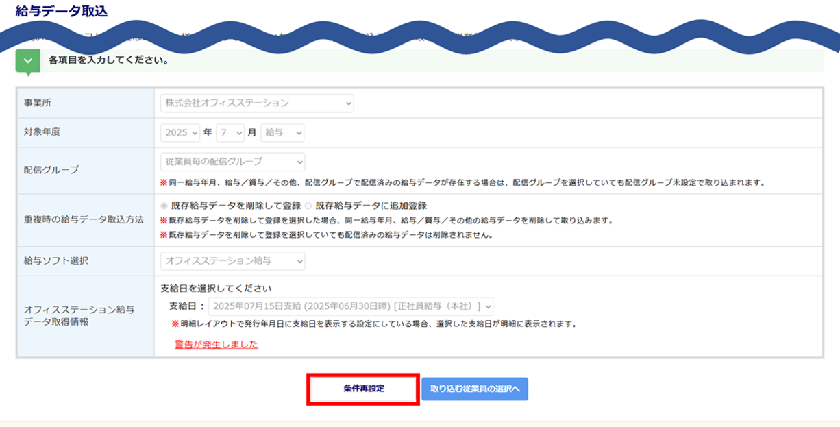 オフィスステーション本体側の[Web給与明細]>[毎月処理]>[給与データ取込]をクリックし、画面下部にある[条件再設定]をクリックします。
