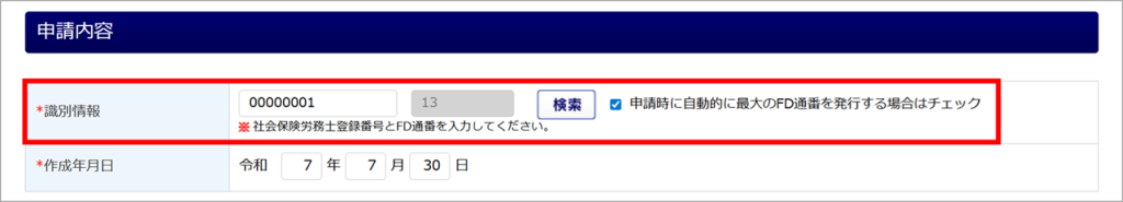 そのため、申請時には、「申請時に自動的に最大のFD通番を発行する場合はチェック」のチェックを外し、FD通番を設定していただく必要があります。