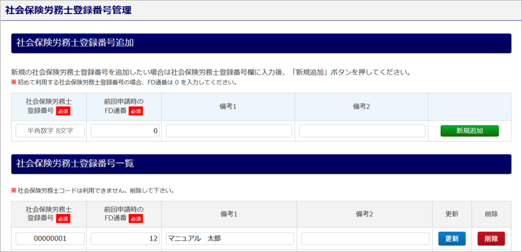 [マスタ管理]>[社労士登録番号管理]にて、「前回申請時のFD通番」の情報を編集することができます。