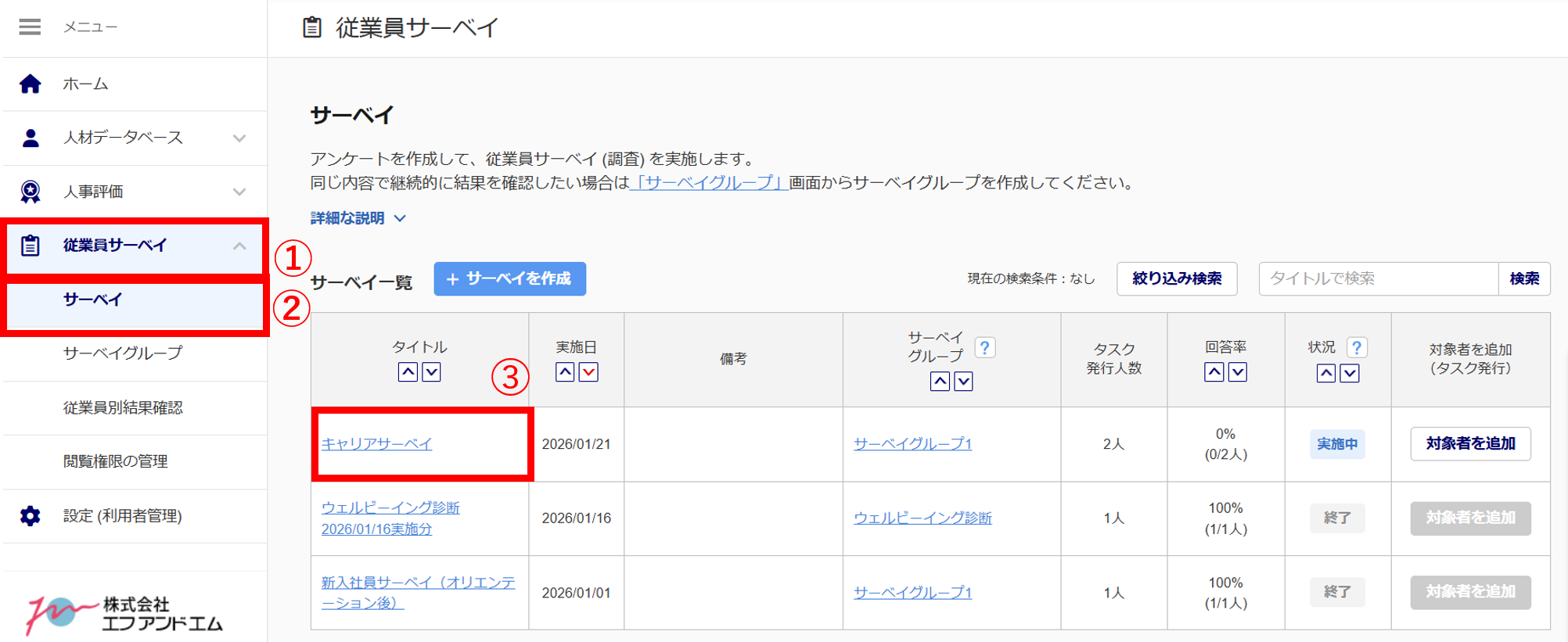 メニュー[従業員サーベイ](①)>[サーベイ](②)>「サーベイ一覧」の「タイトル」列(③)から確認したいタイトルをクリックします。