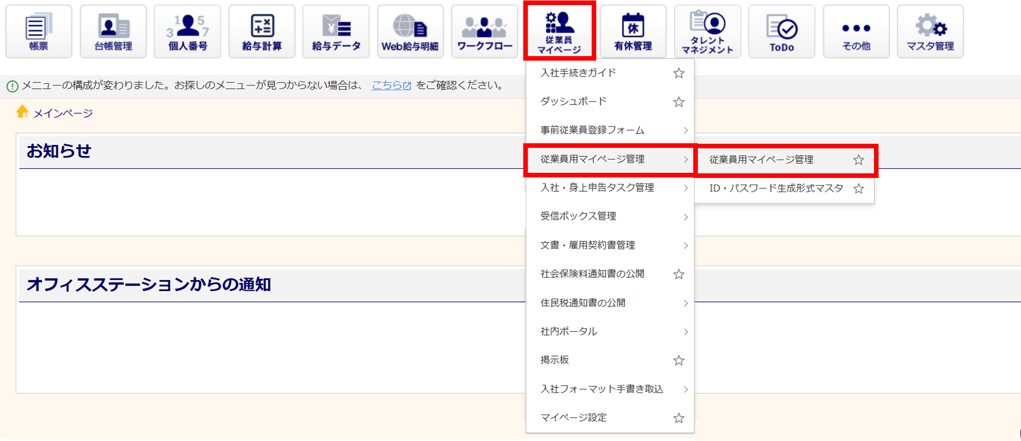 [従業員マイページ]>[従業員用マイページ管理]>[従業員用マイページ管理]をクリックします。