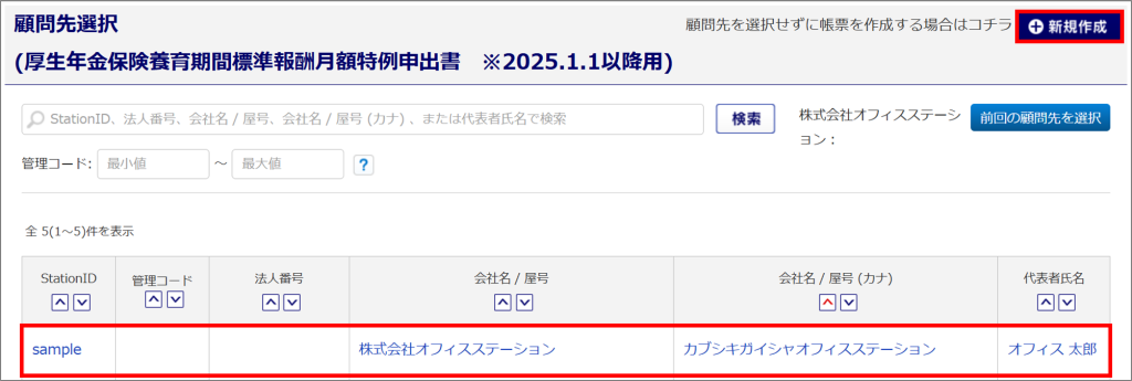 ※顧問先を選択せずにスポットでのお手続きの場合は、[新規作成]をクリックしてください。