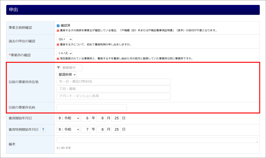 養育し始めた月の前月に勤務していた事業所の情報を入力します。