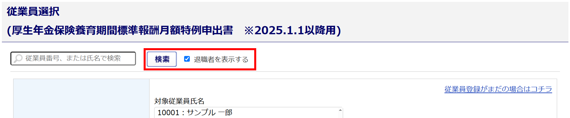 「退職者を表示する」にチェック、[検索]をクリックすると退職者が表示されます。