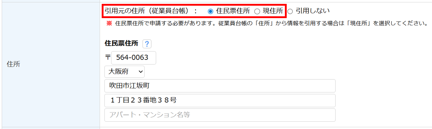 住所情報を従業員台帳の「住民票住所」から引用するか、「現住所」から引用するかを選択します。