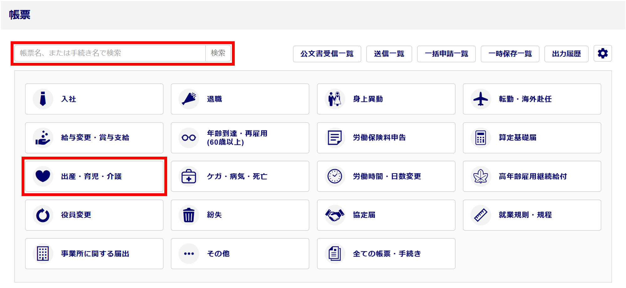 検索窓に帳票名または帳票名の一部を入力し[検索]をクリックします。