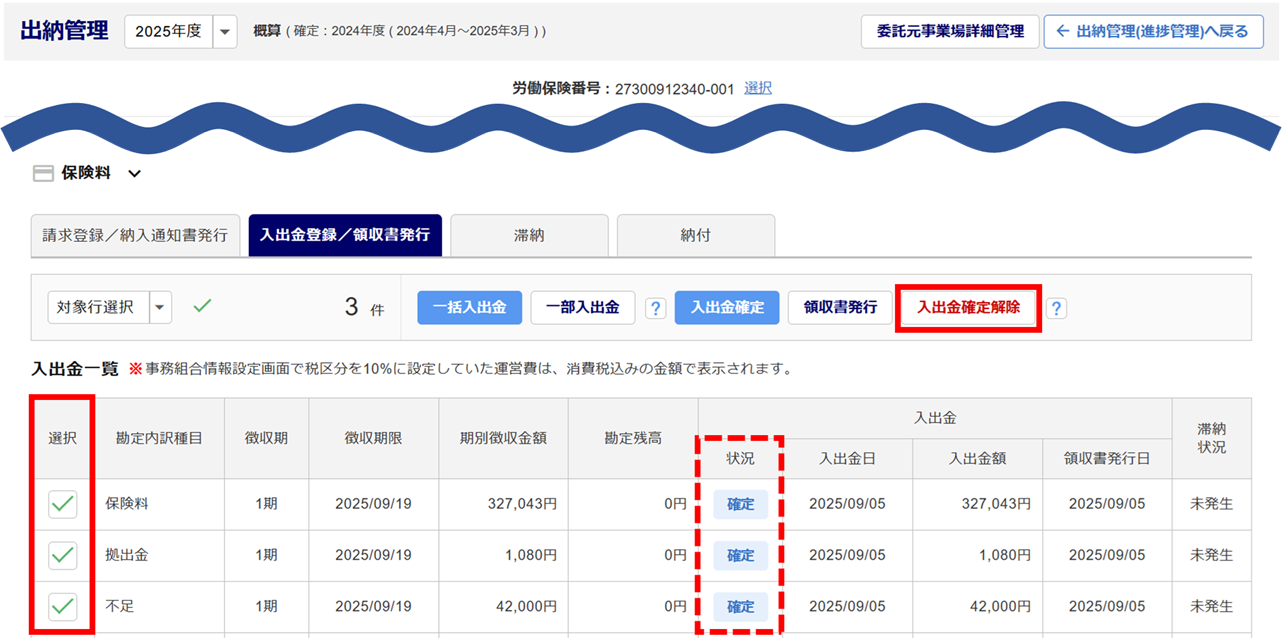 確定解除をおこなうデータの「選択」列にチェックし、[入出金確定解除]>[解除]をクリックします。