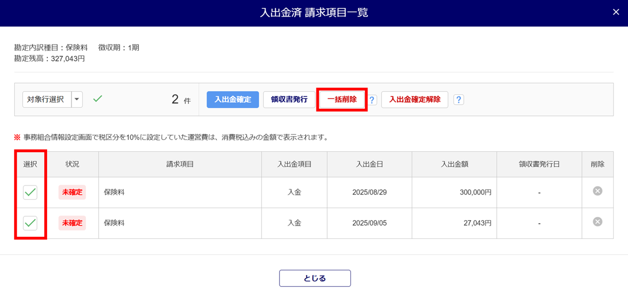 「入出金済 請求項目一覧」ウィンドウに表示されている複数の入金データを一括で削除する場合は、