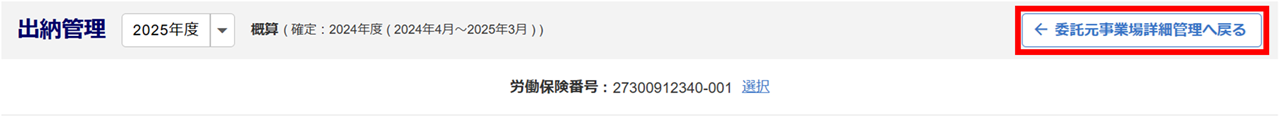 「出納管理」画面右上の[委託元事業場詳細管理へ戻る]をクリックすると、最初の保険料データの操作画面に戻ることができます。