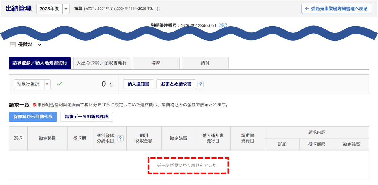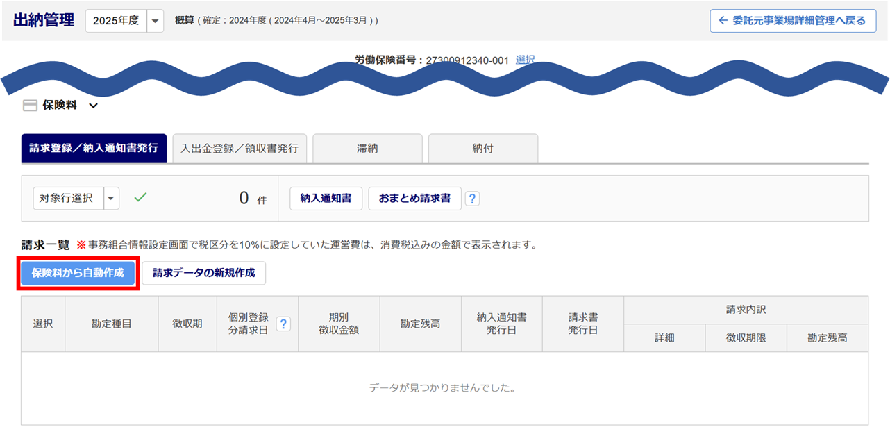 「出納管理」画面の「請求登録/納入通知書発行」タブでも、[保険料から自動作成]から、保険料データを基に請求データを作成することができます。