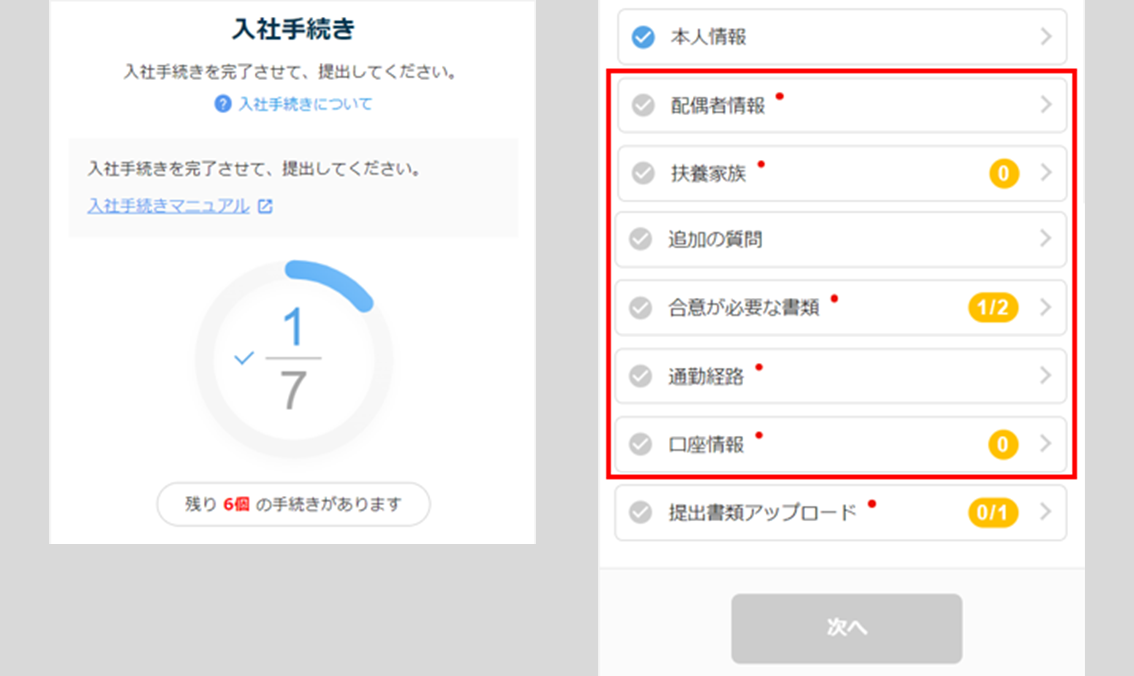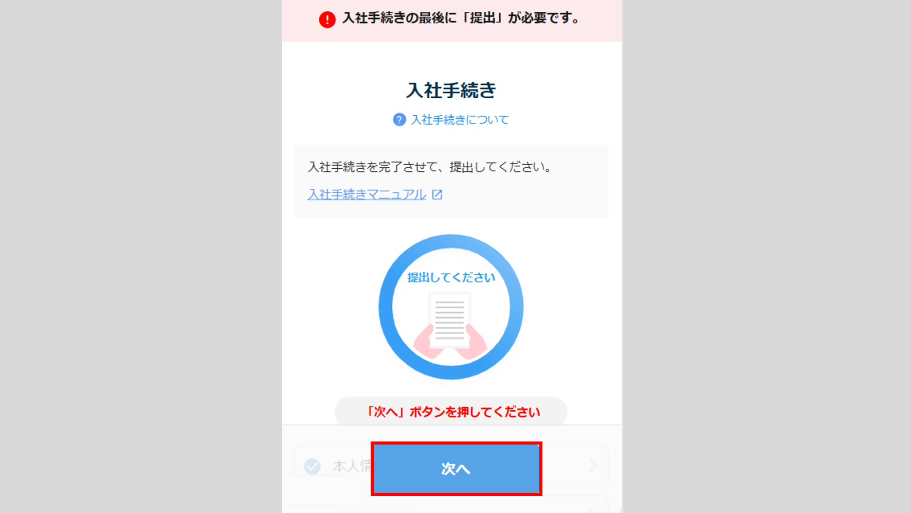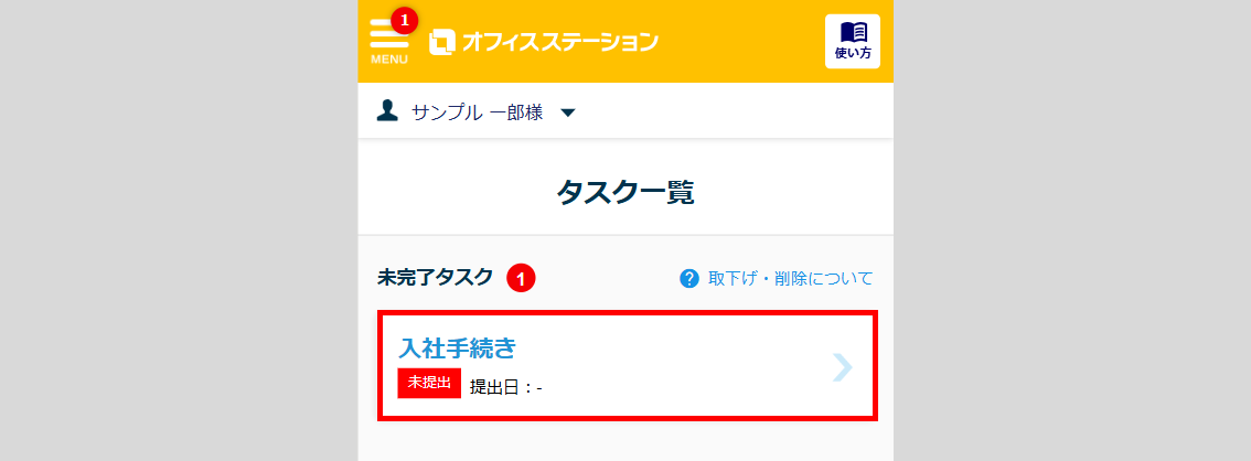 ※タスクに「入社手続き」が表示されていない場合、管理者からのタスク発行がおこなわれていない状態です。