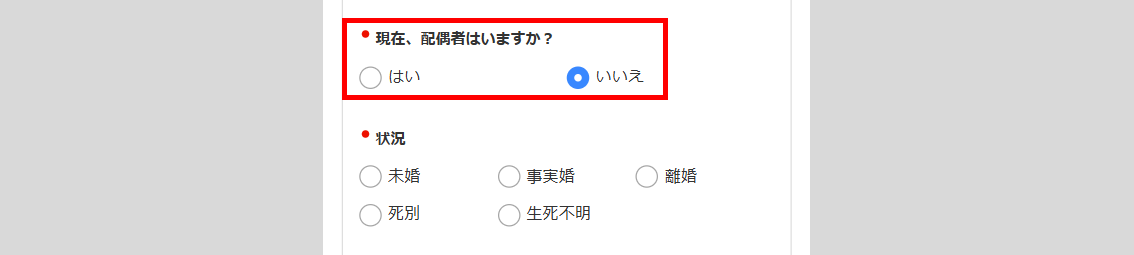 「現在、配偶者はいますか?」に「いいえ」を選択します。「状況」が表示されるので入力します。