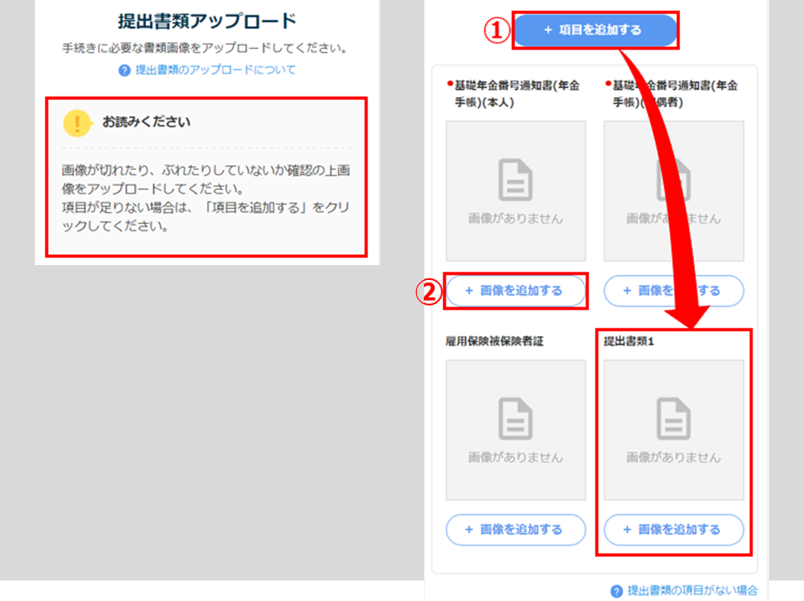 指定の提出書類以外の画像をアップロードする場合は、[項目を追加する](①)をクリックします。