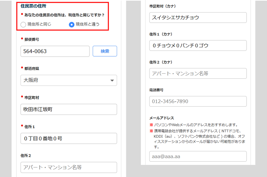「あなたの住民票の住所は、現住所と同じですか?」に「現住所と違う」を選択し、新たに表示される住所入力欄に「住民票の住所」を入力します。「電話番号」「メールアドレス」を入力します。