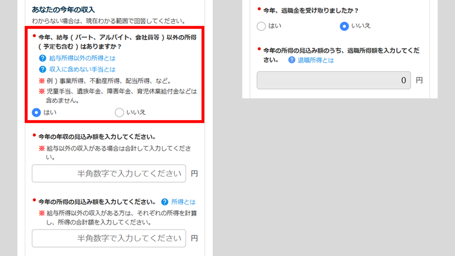 「学生ですか?」および「今年、給与 ( パート、アルバイト、会社員等 ) 以外の所得 ( 予定も含む ) はありますか?」に「はい」を選択している場合