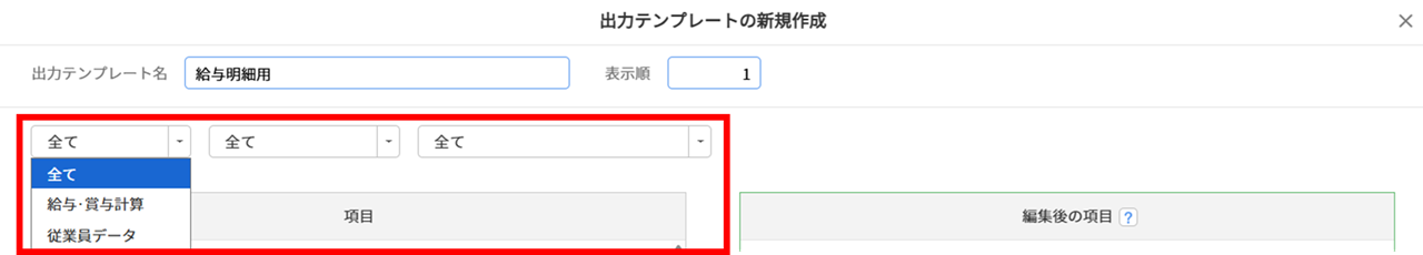 「項目」欄で出力が必要な項目を選択し、「編集後の項目」欄にドラッグ&ドロップで移動します。
