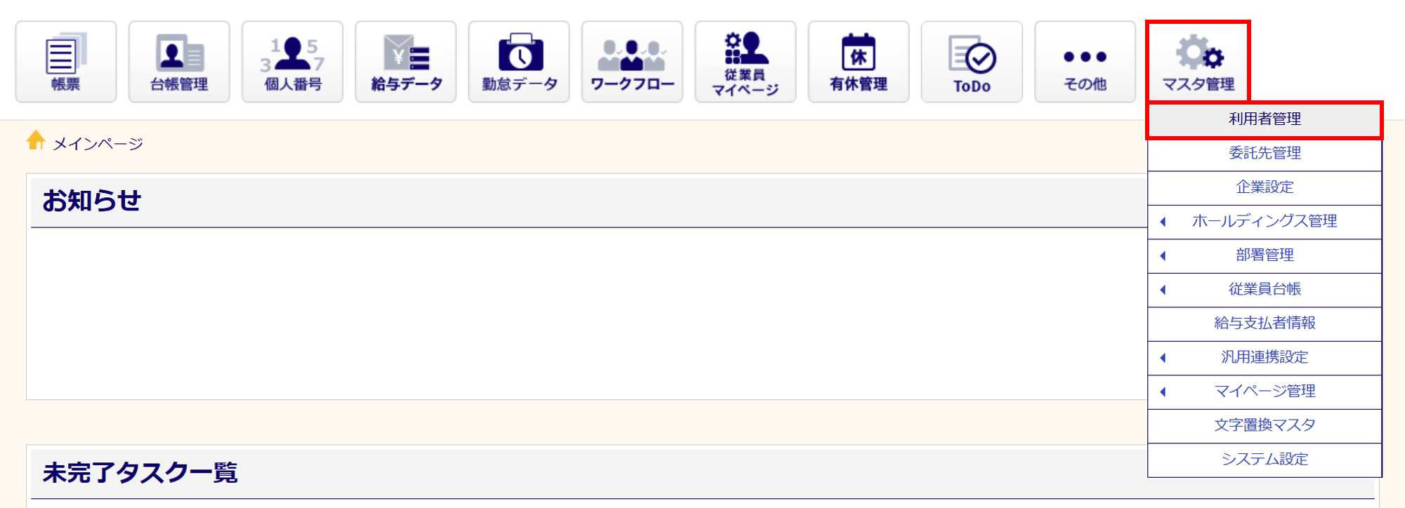 「管理者」権限を持たないログイン者の場合、「利用者管理」は表示されません。