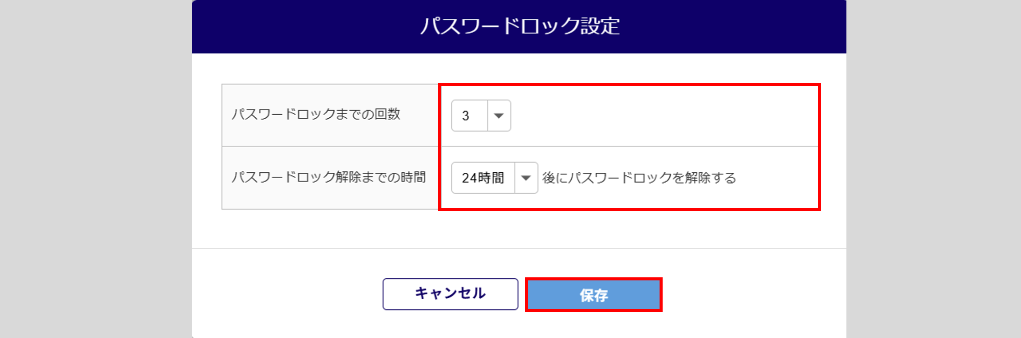 「パスワードロックまでの回数」と「パスワードロック解除までの時間」を設定し、[保存]をクリックします。