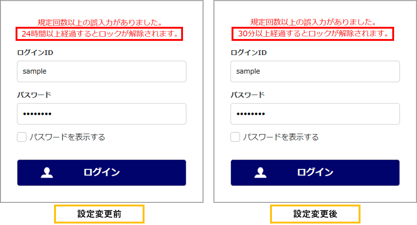 「パスワードロックまでの回数」で設定した回数は、ログイン画面で誤って入力したパスワードの回数と、二段階認証画面で誤って入力した回数の合計となります。