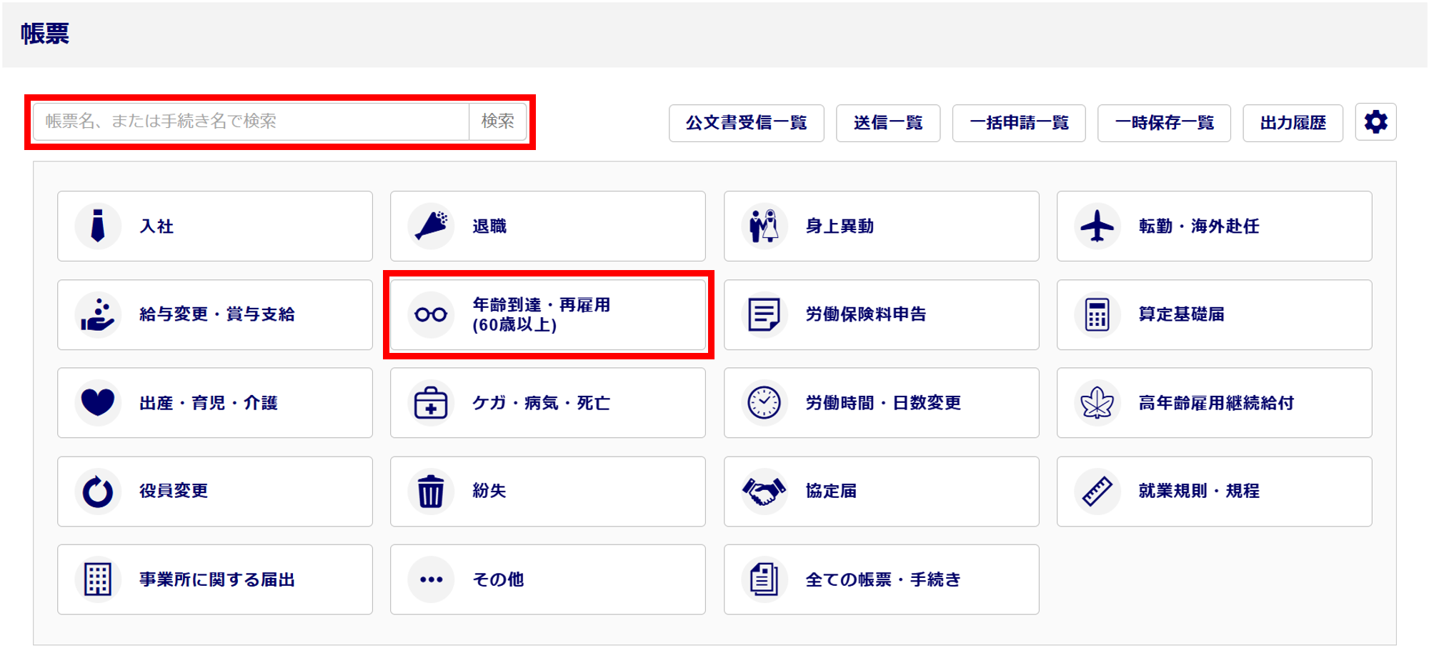 検索窓に帳票名または帳票名の一部を入力し[検索]をクリックします。