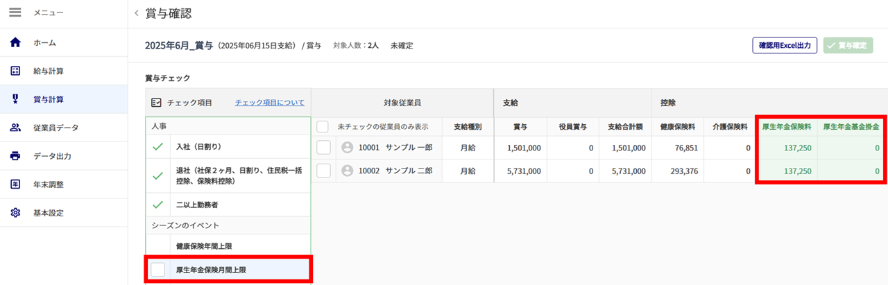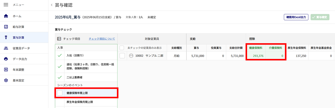 また、賞与計算確認時に、上限を超過している従業員を抽出することができます。