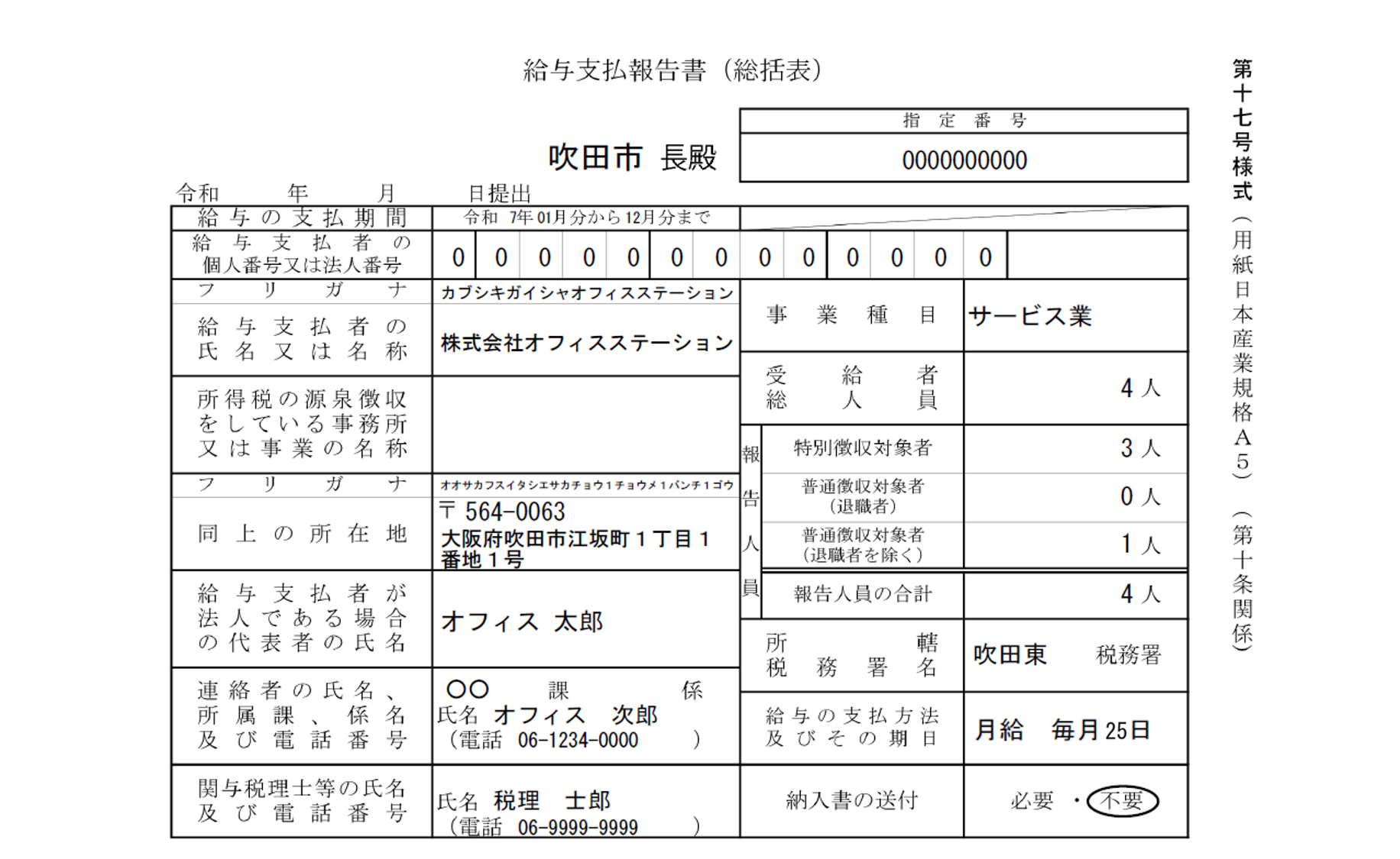 | 報告人員 | 特別徴収対象者 「住民税徴収区分」が『特別徴収』である従業員数 普通徴収対象者(退職者) 「住民税徴収区分」が『普通徴収』、かつ、「退職年月日」が設定されている従業員数 普通徴収対象者 (退職者を除く) 「住民税徴収区分」が『普通徴収』、かつ、「退職年月日」が設定されていない従業員数 報告人員の合計 上記対象者の合計人数 |