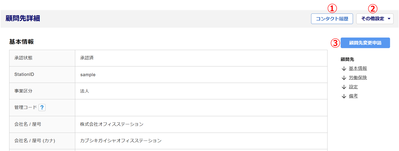 | ① | コンタクト履歴 | 顧問先担当者とのやり取りの履歴等を登録・確認します。 |