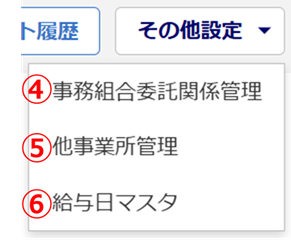 他事業所情報の管理や、事務組合委託関係管理、給与日マスタの登録メニューが表示されます。