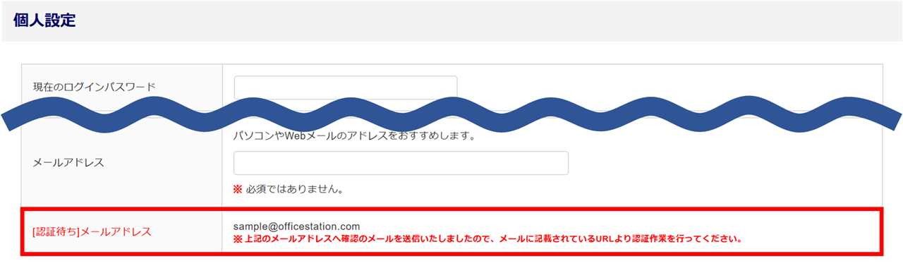 「個人設定」画面にて、登録または変更時に入力したメールアドレス宛に「[オフィスステーション]利用者メールアドレス認証のご案内」メールが送信されます。