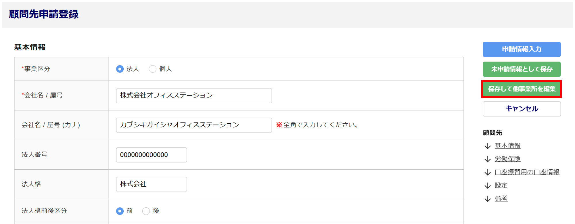 新規で顧問先情報を入力し、[保存して他事業所を編集]から進んだ場合は、本マニュアル内「他事業所情報の入力」へお進みください。