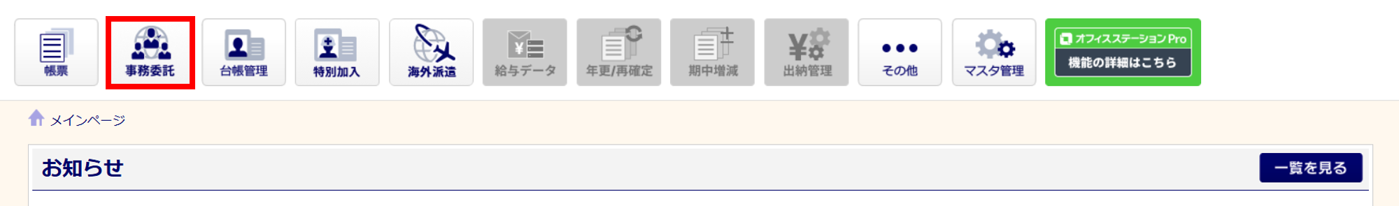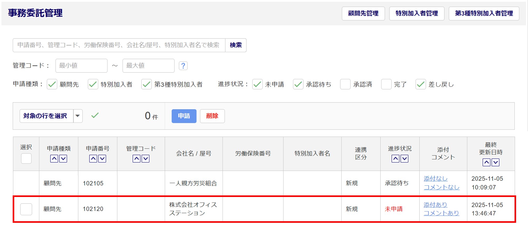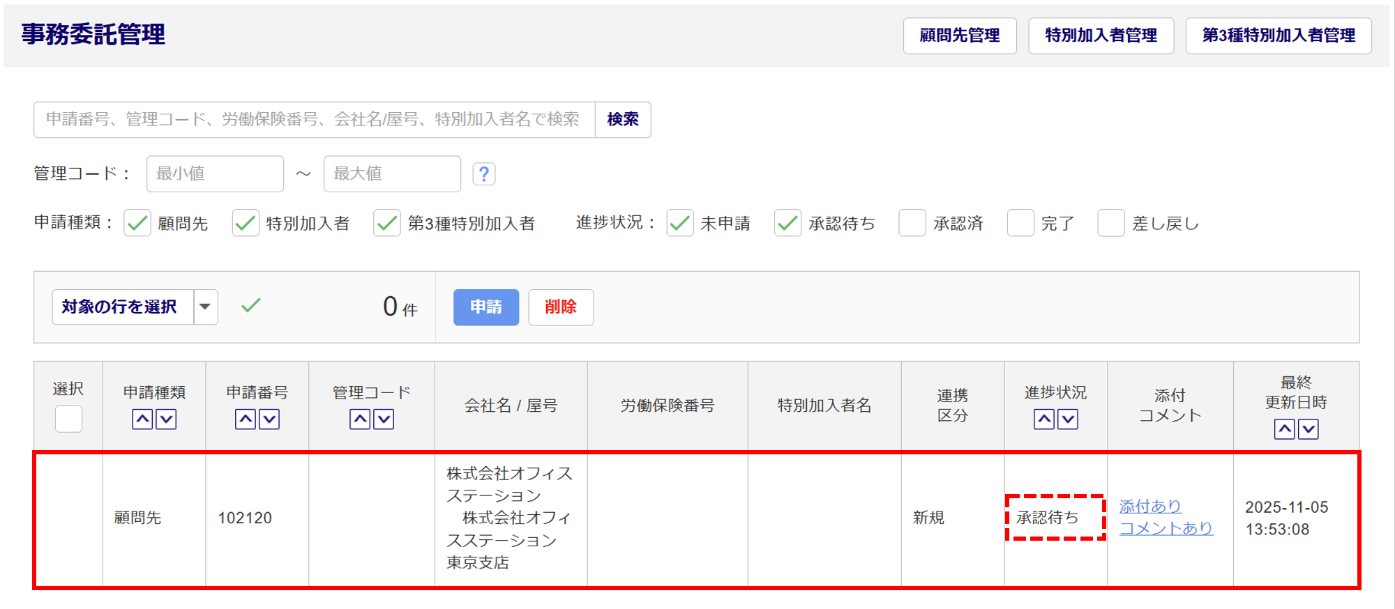 申請後、「事務委託管理」画面が表示されます。