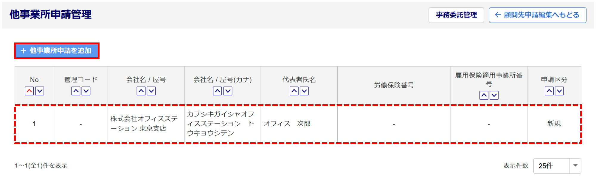 入力情報が保存され、「他事業所申請管理」画面に、保存した他事業所が表示されます。