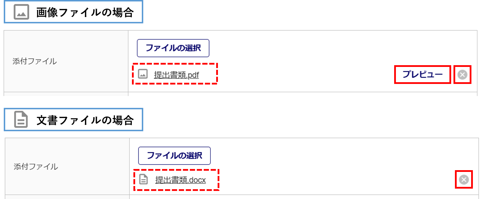ファイルの添付が完了すると、「添付ファイル」項目にファイル名が表示されます。