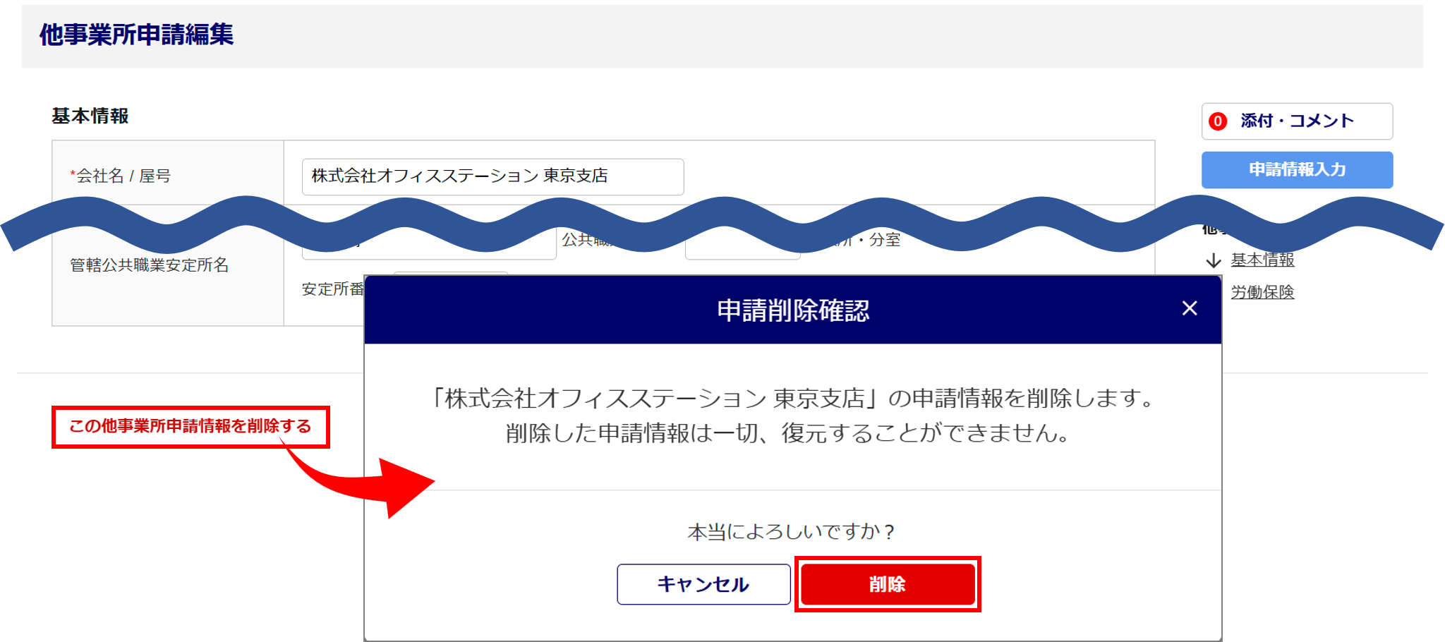 [この他事業所申請情報を削除する]をクリックすると、「申請削除確認」画面が表示されますので、内容を確認後、[削除]をクリックします。