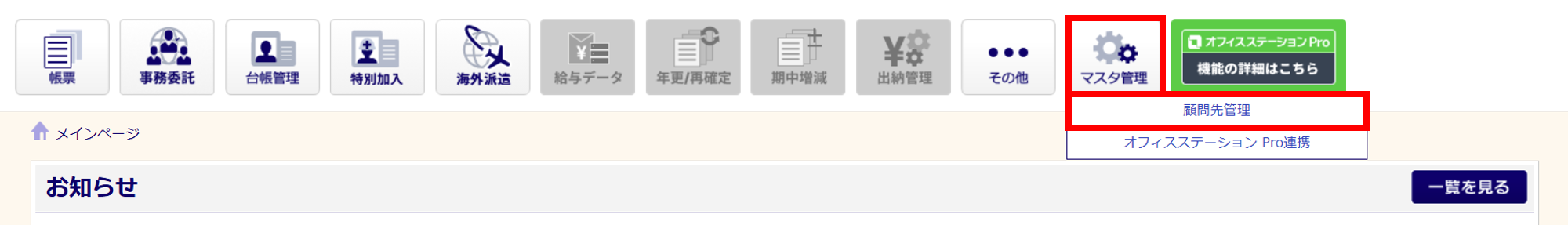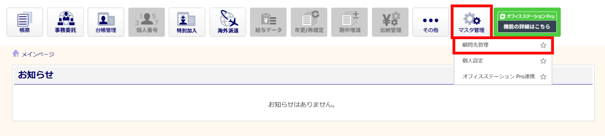 [マスタ管理]をクリックし、表示されるメニュー内の[顧問先管理]をクリックします。