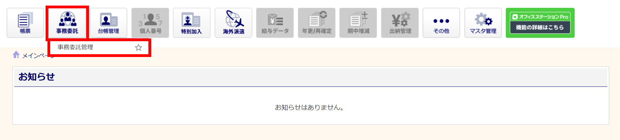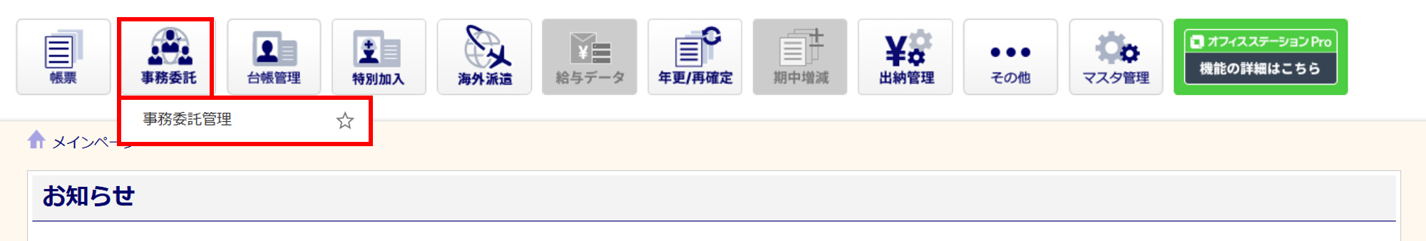 [事務委託]をクリックし、表示されるメニューの[事務委託管理]をクリックします。
