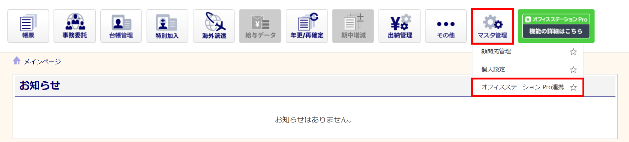 [マスタ管理]をクリックし、表示されるメニュー内の[オフィスステーション Pro連携]をクリックします。